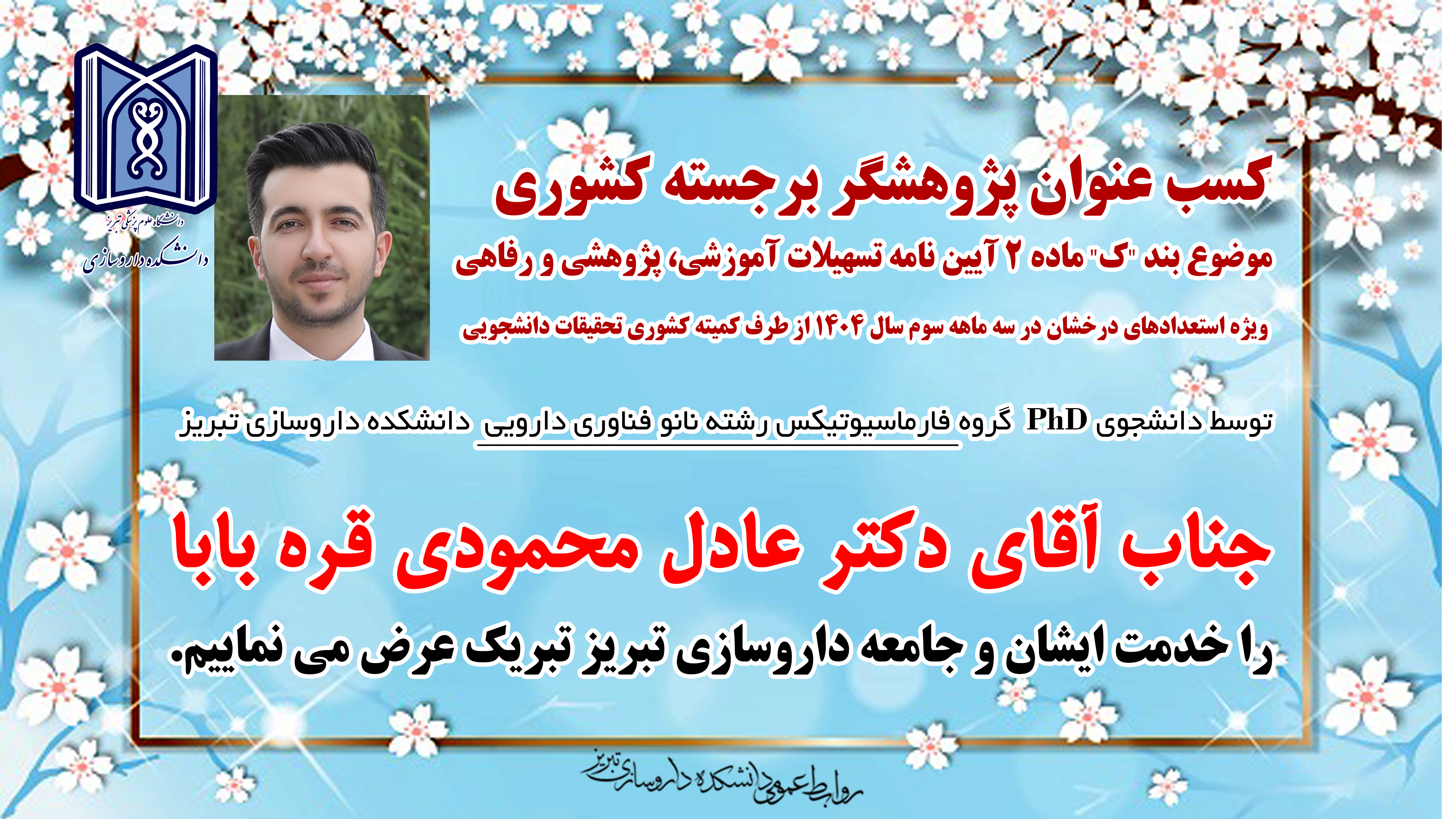 تاریخ انتشار : سهشنبه ۱۳ آبان ۱۴۰۴ تعداد بازدید کنندگان خبر : 25 زمان مطالعه : 1 دقیقه دکترعادل محمودی قره بابا نانو فناوری دارویی پژوهشگر برجسته کشوری 1404 - کد خبر : 96458 کپی تصاویر ارسال نظر ثبت