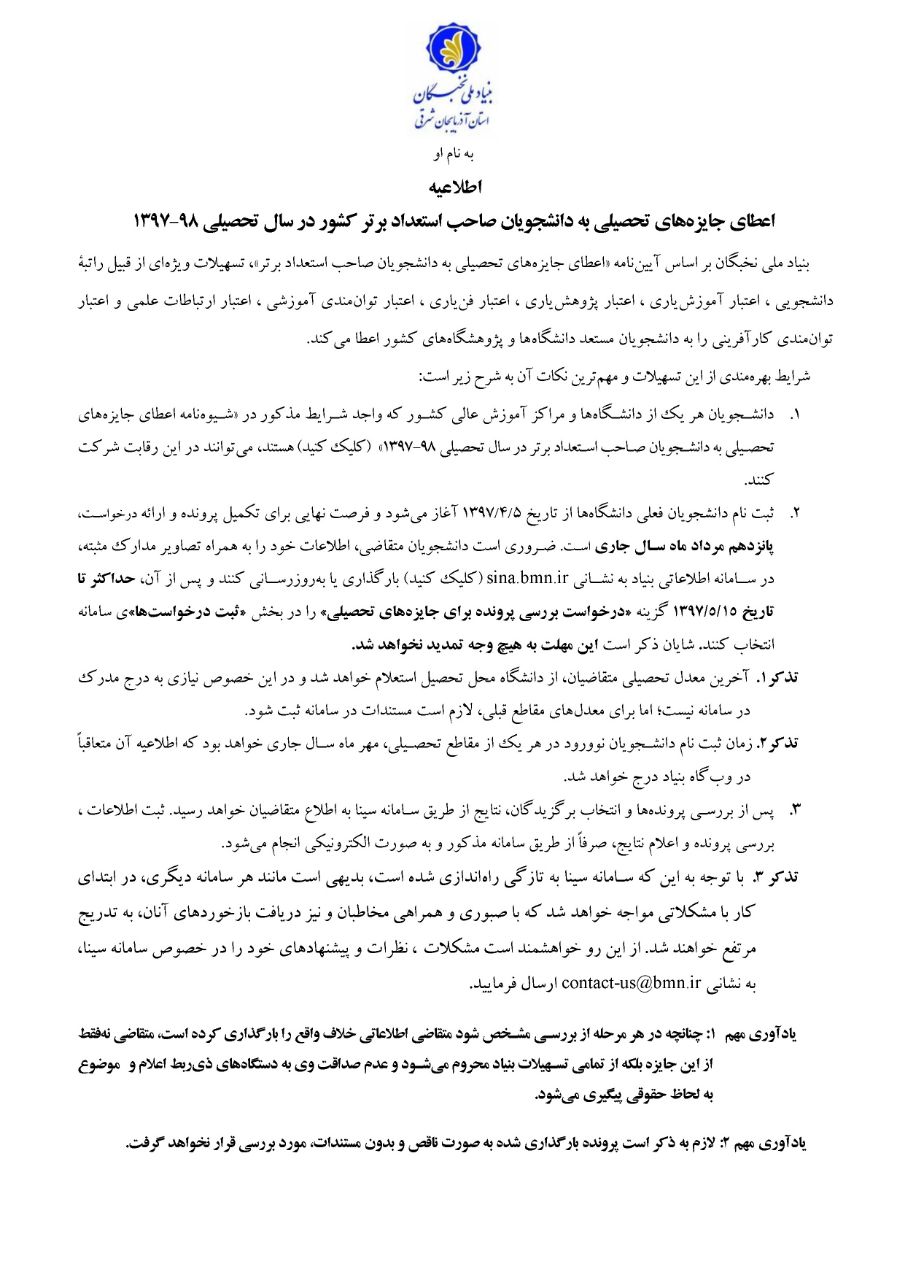 فراخوان ثبت نام جوایز تحصیلی بنیاد ملی نخبگان برای سال تحصیلی ۹۸-۱۳۹۷