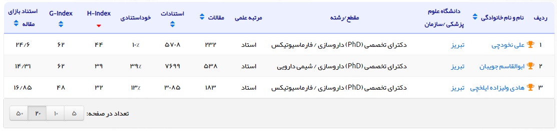 در ويرايش جديد فهرست پژوهشگران ُپراستنادِ يک درصدِ برتر جهان که در ماه July سال 2019 نظام رتبهبندی ESI يا همان Essential Science Indicators منتشرشده است، تعداد پژوهشگران ُپراستنادِ علوم پزشکی کشور به 73 نفر افزايش يافته است. از این تعداد 3 نفر از اعضای هیات علمی دانشکده داروسازی می باشند.