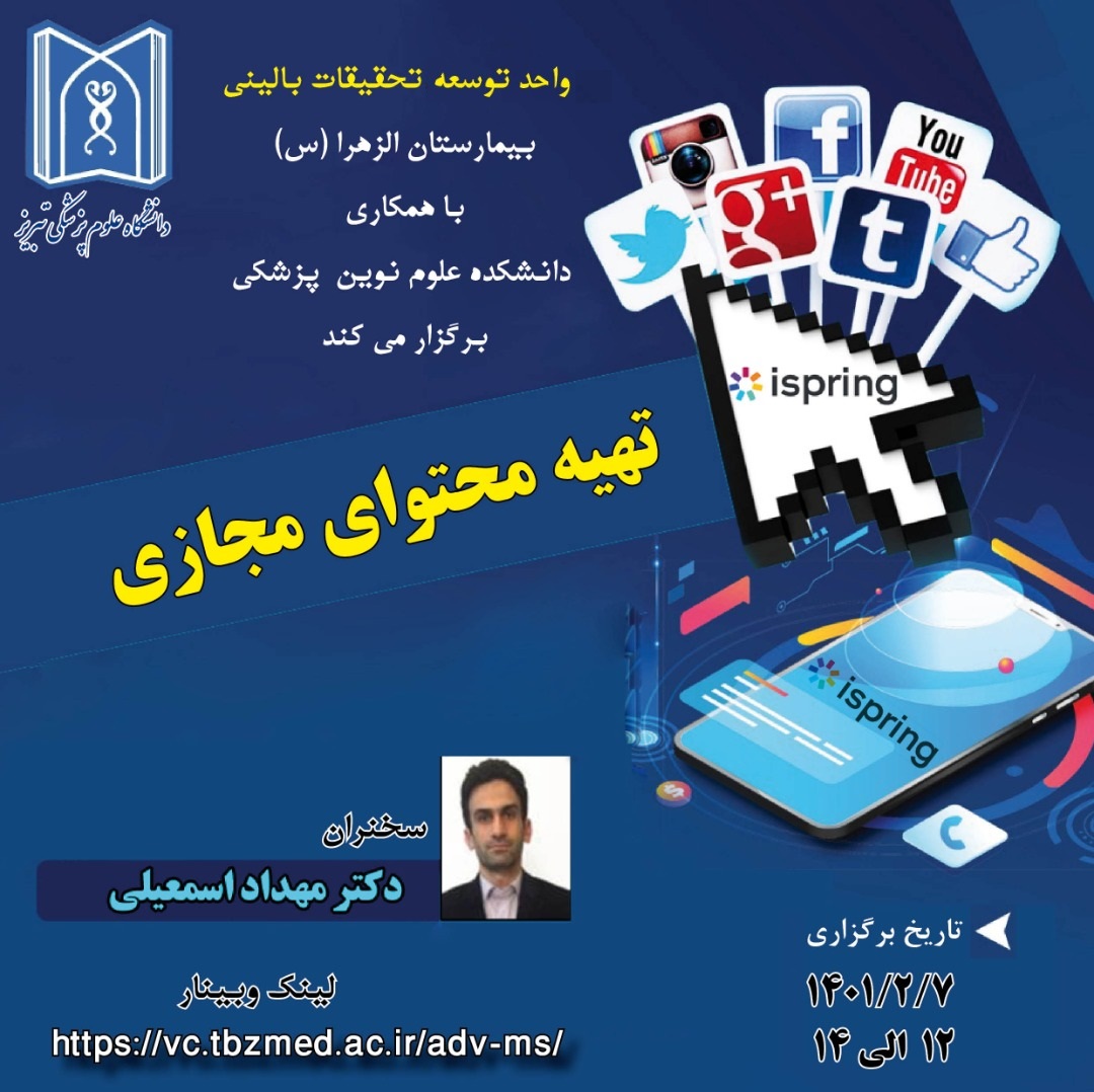 دعوت به شرکت در وبینار تولید محتوای مجازی (واحد توسعه تحقیقات بالینی مرکز آموزشی درمانی الزهراء(س)