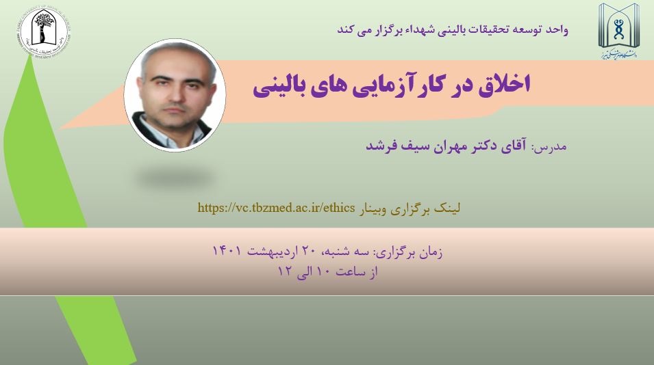 دعوت به شرکت در وبینار اخلاق در کارآزمایی های بالینی - کد خبر : 55817 کپی کلمات کلیدی : دانشگاه علوم پزشکی تبریز بیمارستان شهدای تبریز برگزاری وبینار اخلاق