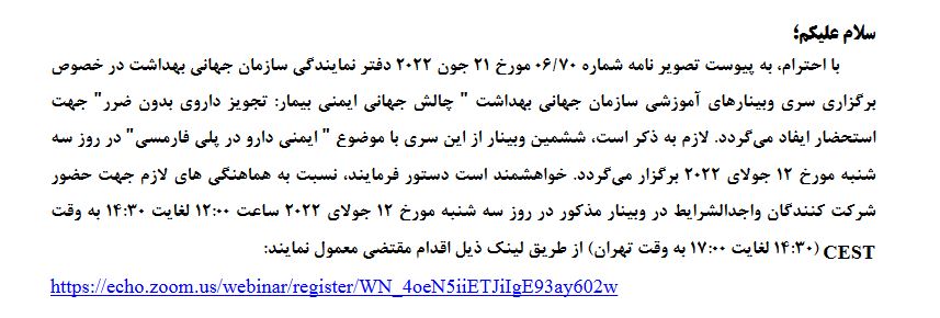 فراخوان برگزاری سری وبینارهای آموزشی سازمان جهانی بهداشت " چالش جهانی ایمنی بیمار: تجویز داروی بدون ضرر