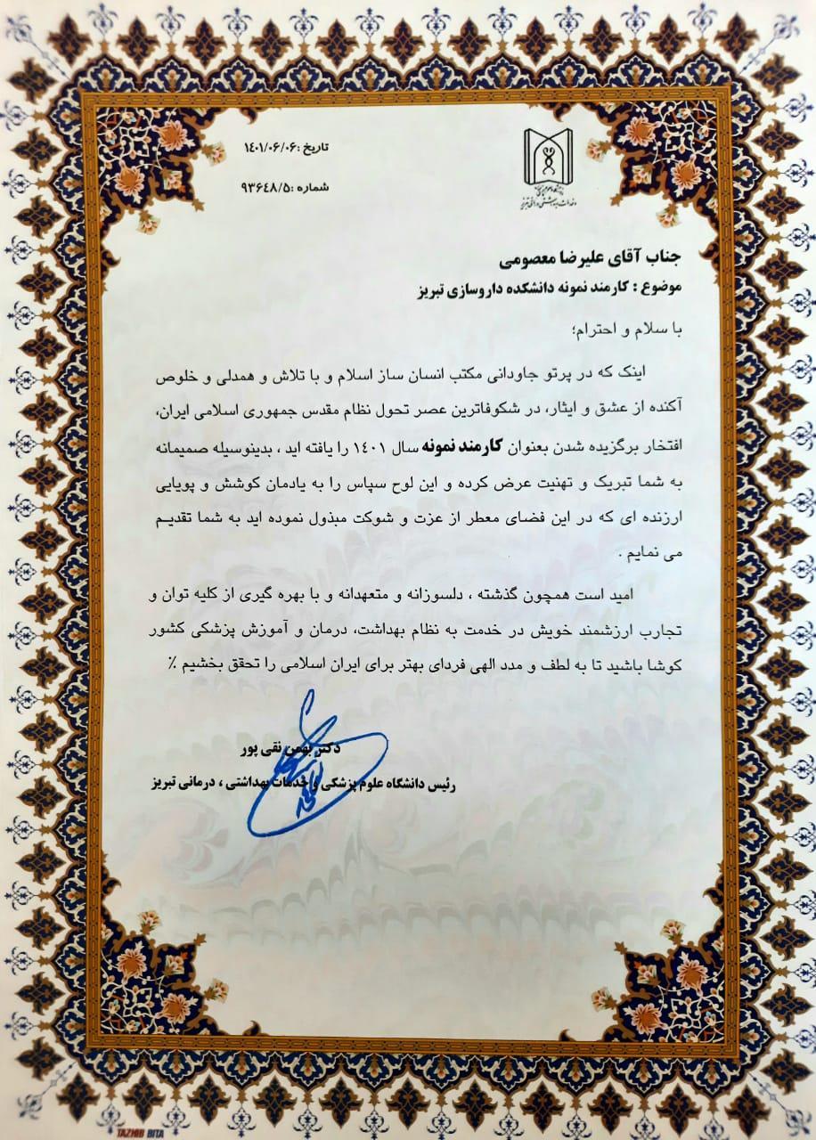 انتخاب آقای علیرضا معصومی به عنوان کارمند نمونه دانشکده داروسازی تبریز در سال ۱۴۰۱