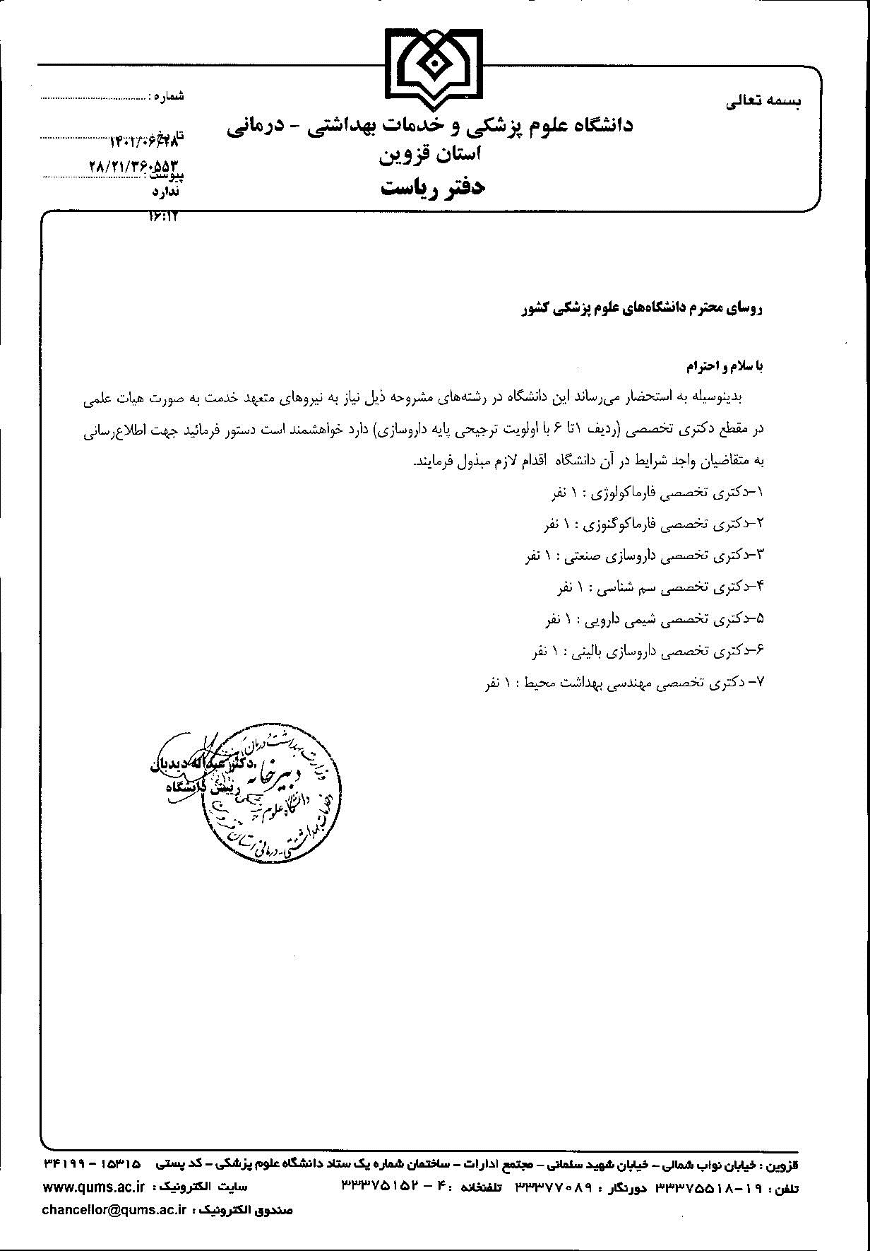 فراخوان اعلام نیاز به نیروهای متعهد خدمت در مقطع دکتری تخصصی در رشته های فارماکولوژی و بهداشت محیط جهت خدمت در دانشگاه علوم پزشکی قزوین