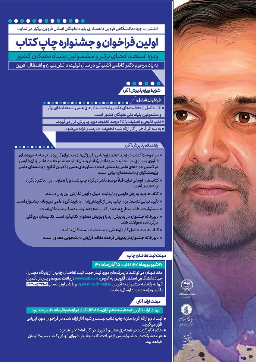 اولین فراخوان و جشنواره چاپ کتاب ویژه اعضای بنیاد ملی نخبگان - کد خبر : 55959 کپی کلمات کلیدی : بنیاد ملی نخبگان علوم پزشکی قزوین جشنواره چاپ کتاب