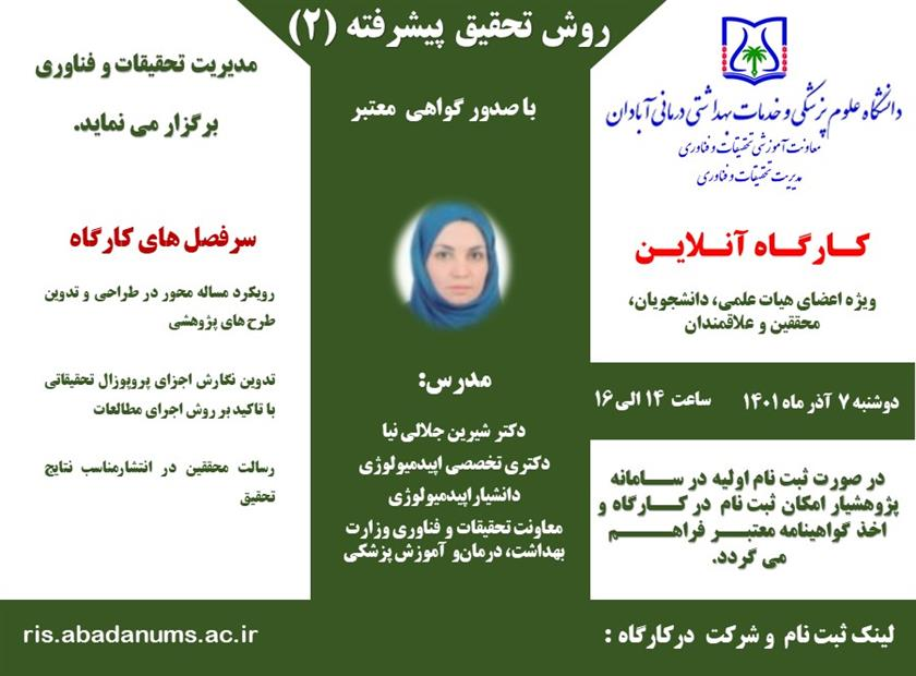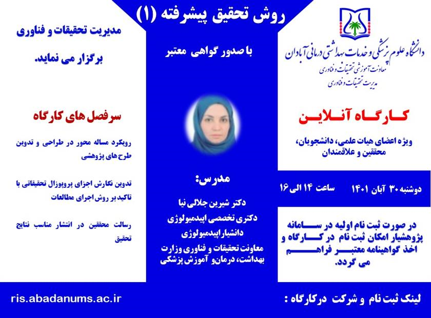 اطلاع رسانی کارگاه روش تحقیق پیشرفته 2 دانشگاه علوم پزشکی آبادان - کد خبر : 55971 کپی کلمات کلیدی : معاونت تحقیقات و فناوری کارگاه روش تحقیق علوم پزشکی آبادان
