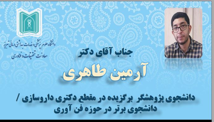 انتخاب آقای آرمین طاهری بعنوان دانشجوی محقق برتر در مقطع دکتری داروسازی و دانشجوی برتر در حوزه فناوری در بیست و یکمین جشنواره پژوهشی دانشگاه علوم پزشکی تبریز
