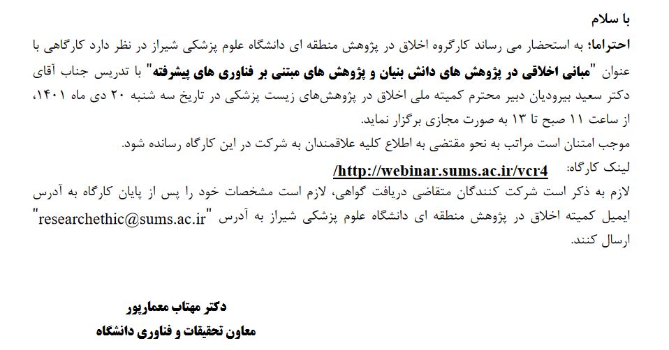 فراخوان کارگاه مبانی اخلاقی در پژوهش های دانش بنیان و پژوهش های مبتنی بر فناوری های پیشرفته دانشگاه علوم پزشکی شیراز