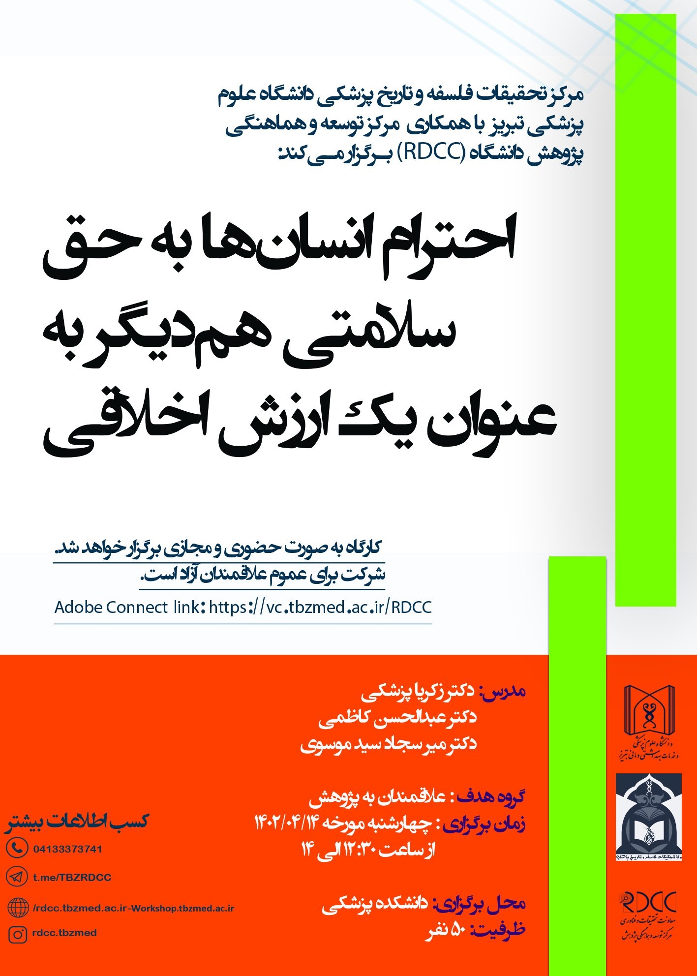 برگزاری کارگاه احترام انسان ها به حق سلامتی همدیگر به عنوان یک ارزش اخلاقی - کد خبر : 56079 کپی کلمات کلیدی : دانشگاه علوم پزشکی تبریز RDCC فلسفه و تاریخ پزشکی کارگاه های آموزشی