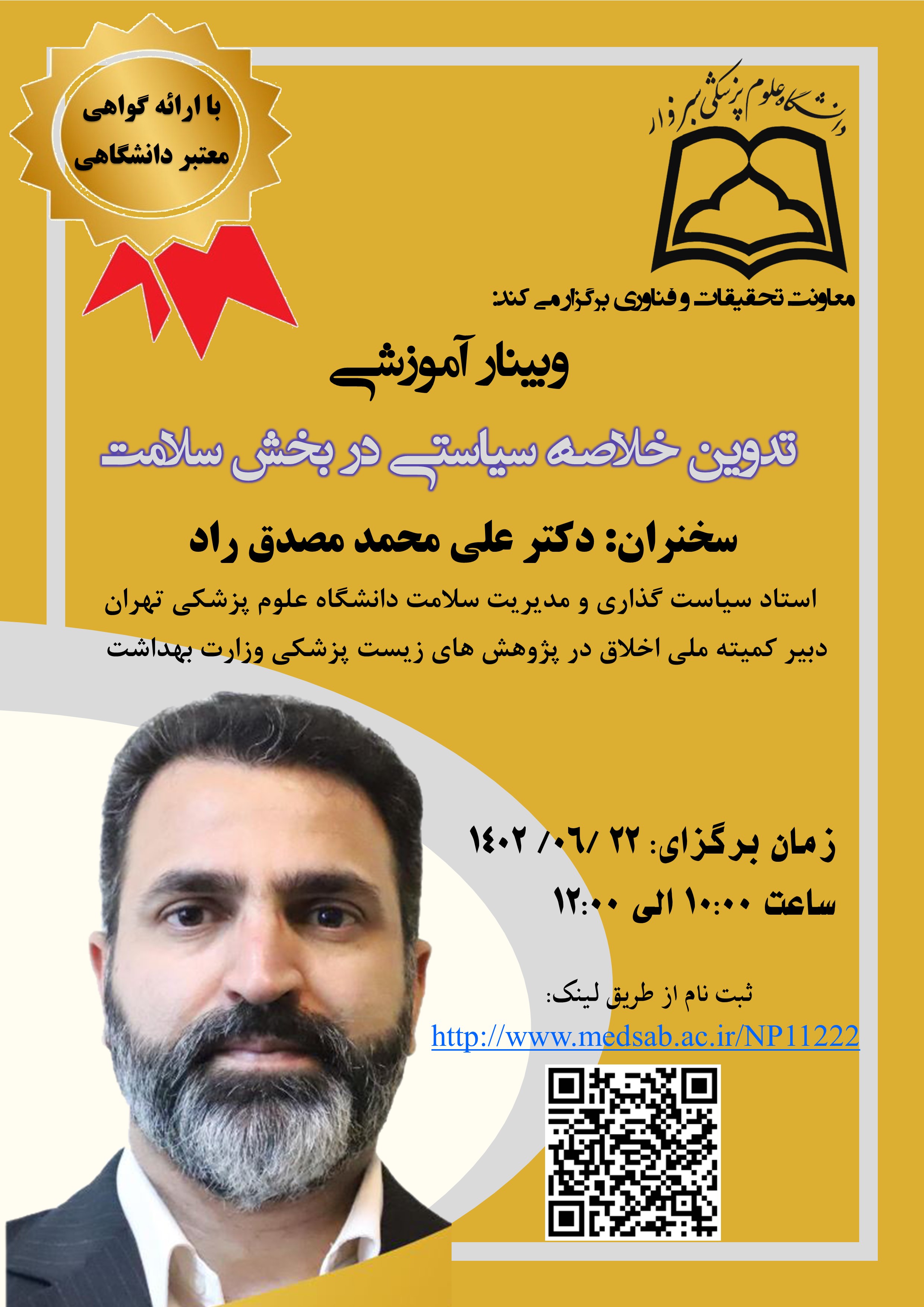 اطلاع رسانی برگزاری وبینار تدوین خلاصه سیاستی در بخش سلامت علوم پزشکی سبزوار - کد خبر : 56115 کپی کلمات کلیدی : معاونت تحقیقات و فناوری علوم پزشکی سبزوار وبینار تخصصی