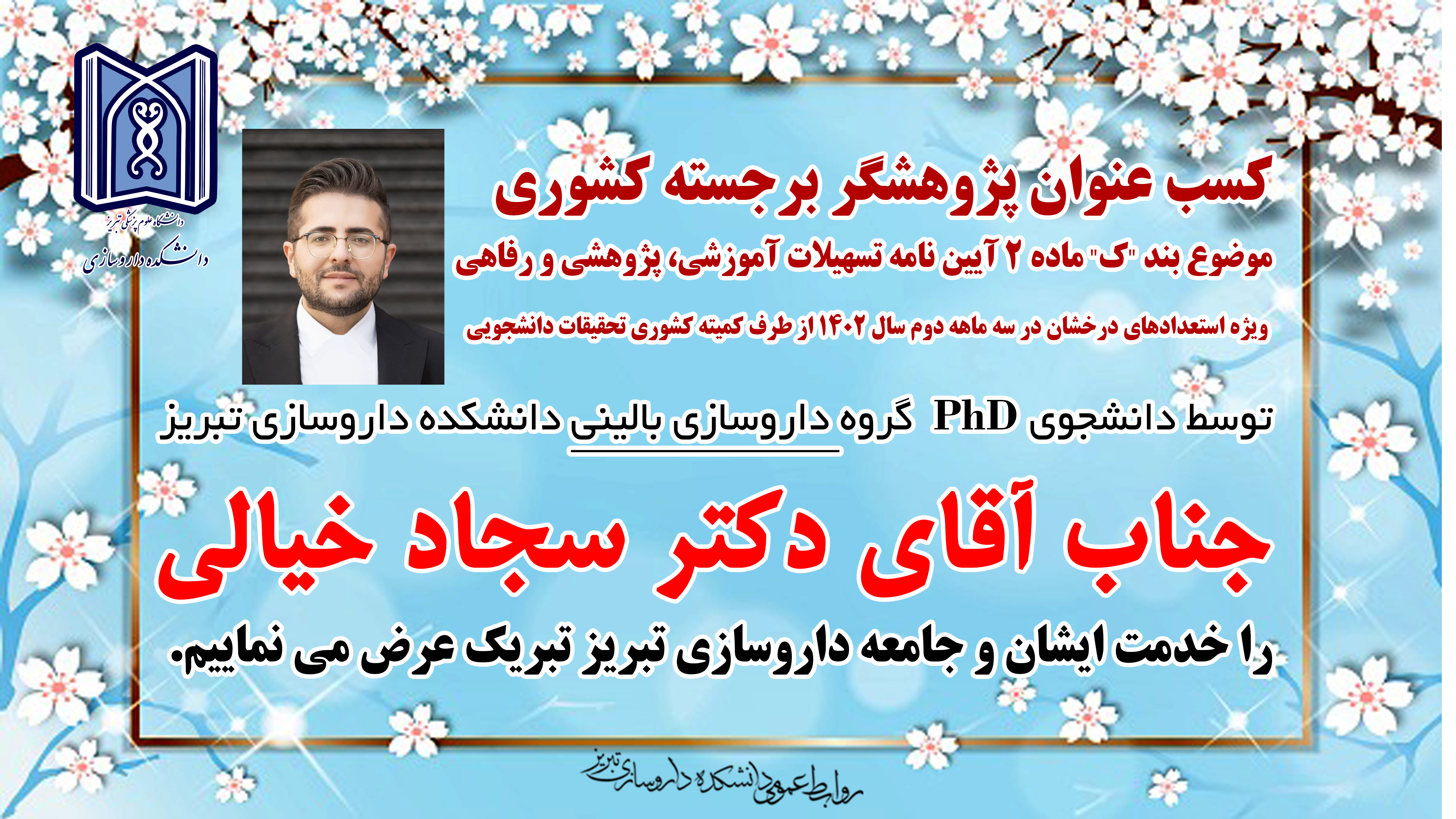 انتخاب آقای دکتر سجاد خیالی به عنوان پژوهشگر برجسته کشوری 1402 - کد خبر : 56172 کپی کلمات کلیدی : دانشکده داروسازی تبریز پژوهشگر برجسته کشوری دکتر سجاد خیالی