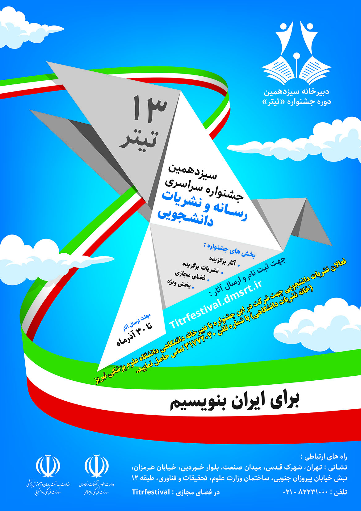 فراخوان سیزدهمین جشنواره نشریات دانشجویی تیتر 13 دانشگاه علوم پزشکی تبریز - آئین نامه جشنواره سراسری رسانه و نشریات دانشجویی تیتر 13 کد خبر : 56183 کپی کلمات کلیدی : دانشگاه علوم پزشکی تبریز فراخوان معاونت فرهنگی دانشگاه