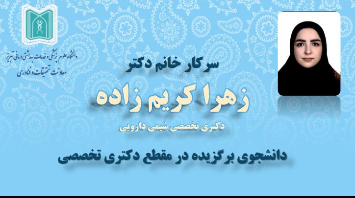 کسب رتبه دانشجوی برگزیده در مقطع دکتری تخصصی توسط خانم دکتر زهرا کریم زاده، فارغ التحصیل رشته شیمی دارویی دانشکده داروسازی