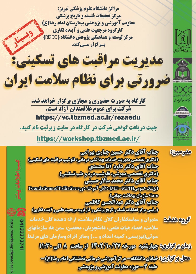 اطلاع رسانی برگزاری وبینار مدیریت مراقبت های تسکینی: ضرورتی برای نظام سلامت ایران - کد خبر : 56212 کپی کلمات کلیدی : دانشگاه علوم پزشکی تبریز RDCC معاونت آموزشی
