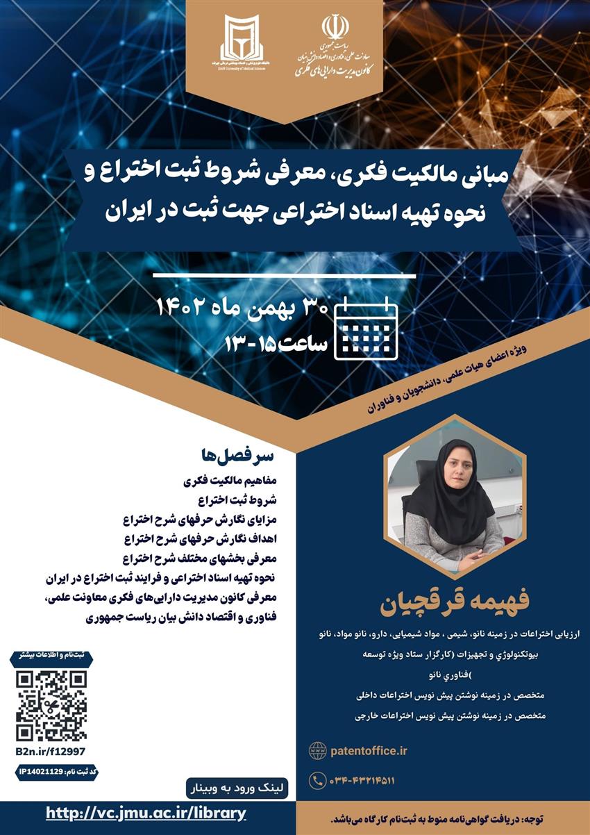 برگزاری کارگاه مبانی مالکیت فکری، معرفی شروط ثبت اختراع و نحوه تهیه اسناد اختراعی جهت ثبت در ایران دانشگاه علوم پزشکی جیرفت