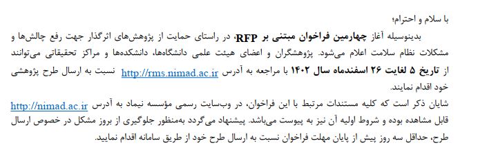اعلام چهارمین فراخوان مبتنی بر RFP مؤسسه نیماد - کد خبر : 56247 کپی کلمات کلیدی : معاونت پژوهشي دانشگاه مؤسسه نیماد فراخوان مبتنی RFP