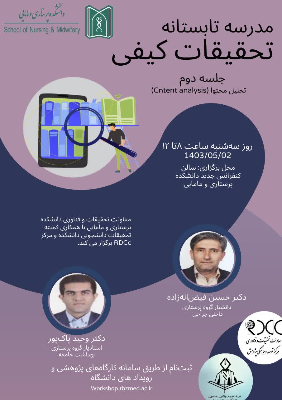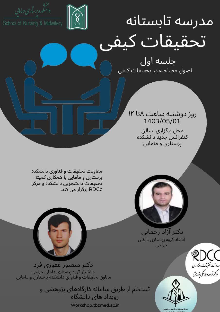 به استحضار میرساند معاونت تحقیقات و فناوری دانشکده پرستاری و مامایی در نظر دارد یک دوره جامع تحقیقات کیفی با عنوان «مدرسه تابستانه تحقیقات کیفی» را در مرداد ماه سال جاری با همکاری RDCC دانشگاه و کمیته تحقیقات دانشجویی برگزار نماید. گروه هدف این برنامه اعضای هیات علمی دانشگاه و دانشجویان دکترا خواهد بود و ثبت نام از طریق سامانه کارگاه های پژوهشی دانشگاه انجام خواهد گرفت. خواهشمند است اطلاع رسانی مقتضی جهت شرکت اساتید و دانشجویان علاقمند در این دوره را مبذول نمایید. به پیوست پوستر کل دوره و پوستر هفته اول ارسال می گردد.