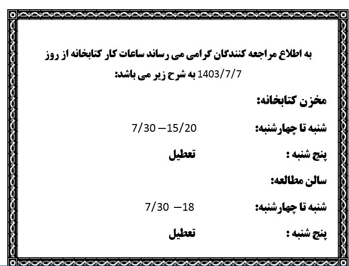 ساعت کاری کتابخانه دانشکده داروسازی مهر 1403 - کد خبر : 56336 کپی کلمات کلیدی : دانشکده داروسازی تبریز کتابخانه داروسازی تبریز اطلاعیه ساعت کار