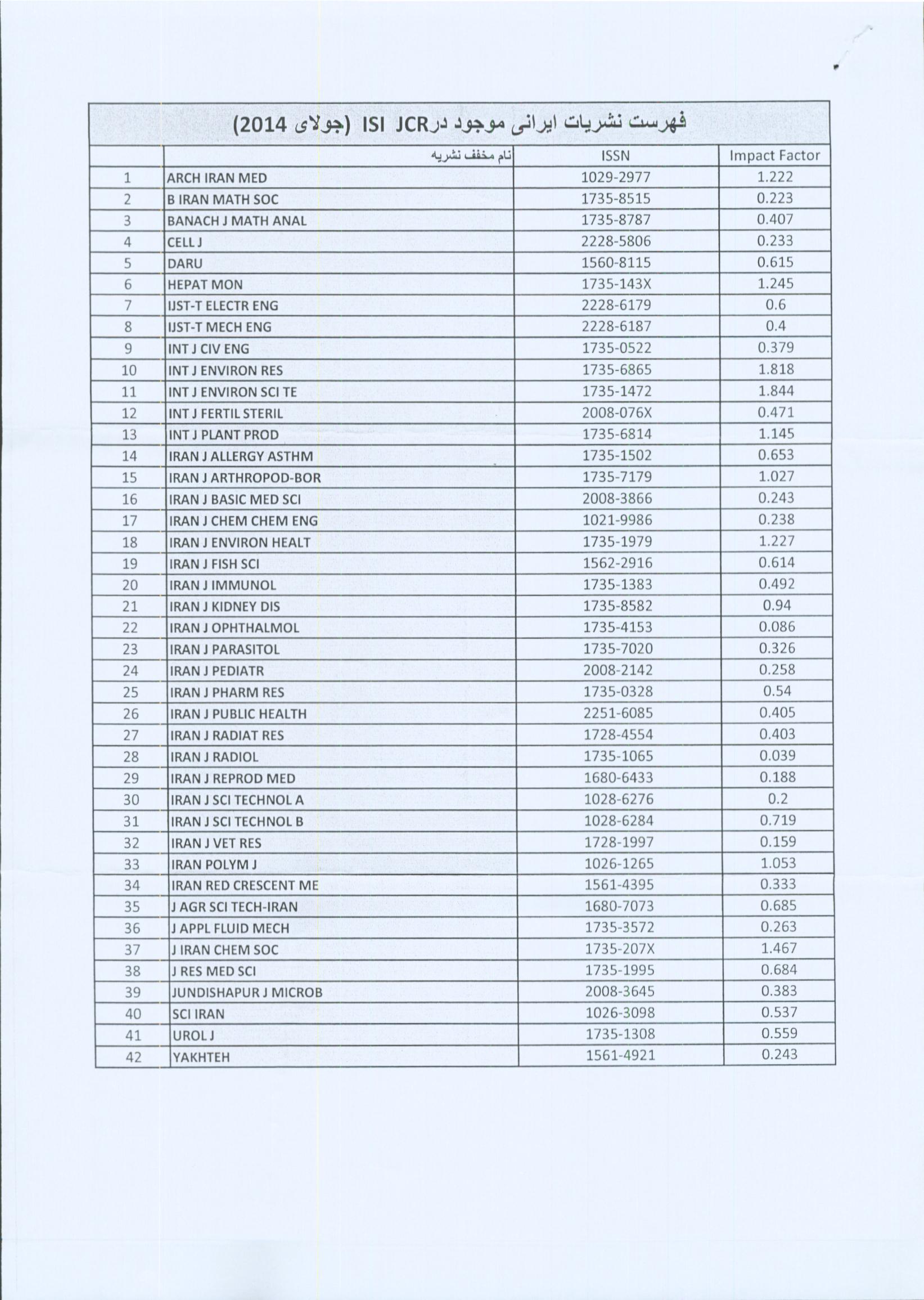 فهرست نشريات ايراني موجود در JCR مربوط به پایگاه تامسون رویترز" ISI "همراه با ضریب تاثیر