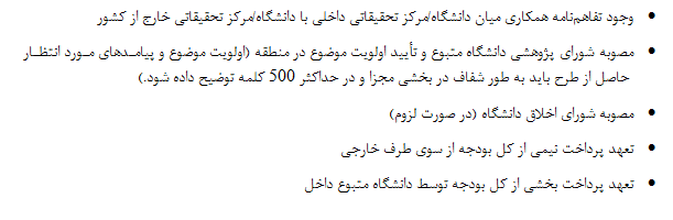 لازم به ذکر است در پایان ،شورای تخصصی بین المللی معاونت تحقیقات و فناوری پروژه های ارسالی را بررسی و در صورت تصویب مورد پشتیبانی قرار خواهد داد