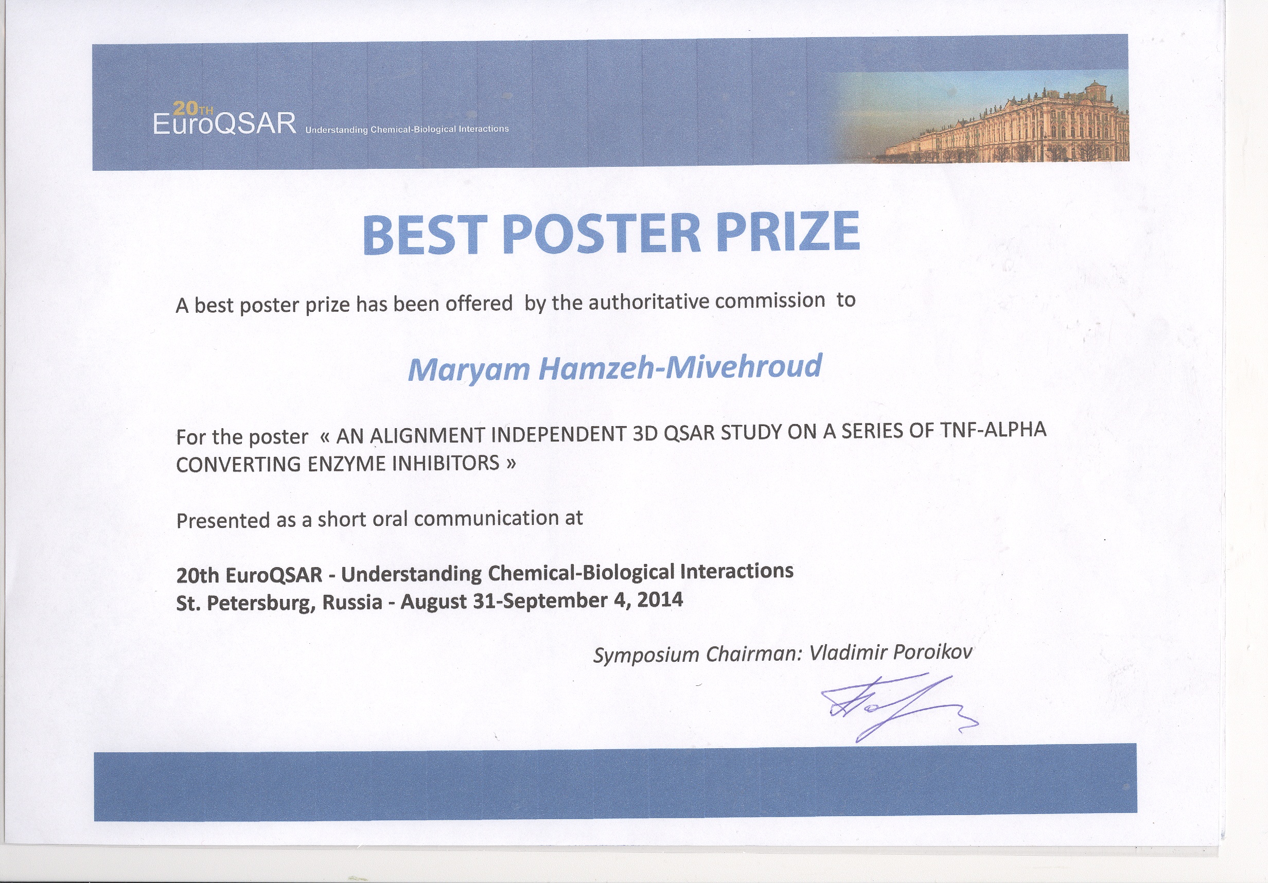 به اطلاع میرساند پوستر سرکار خانم دکتر مریم حمزه میوه رود ،عضو هیئت علمی گروه آموزشی شیمی دارویی دانشکده داروسازی تبریز،در كنفرانس بين المللي EuroQSAR 2014 شهر سنت پترزبورگ-كشور روسيه در تاریخ 31 آگوست- 04 سپتامبر (2014)به عنوان پوستر برگزیده کنفرانس انتخاب شده است