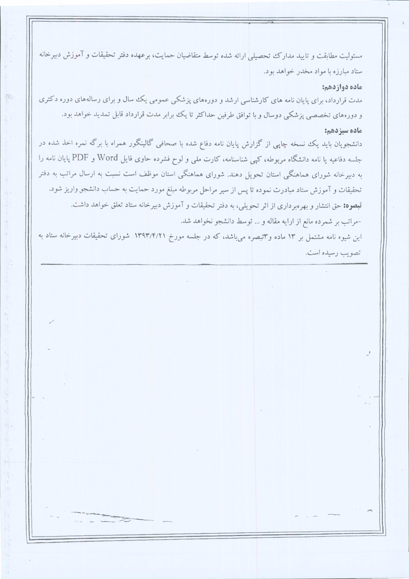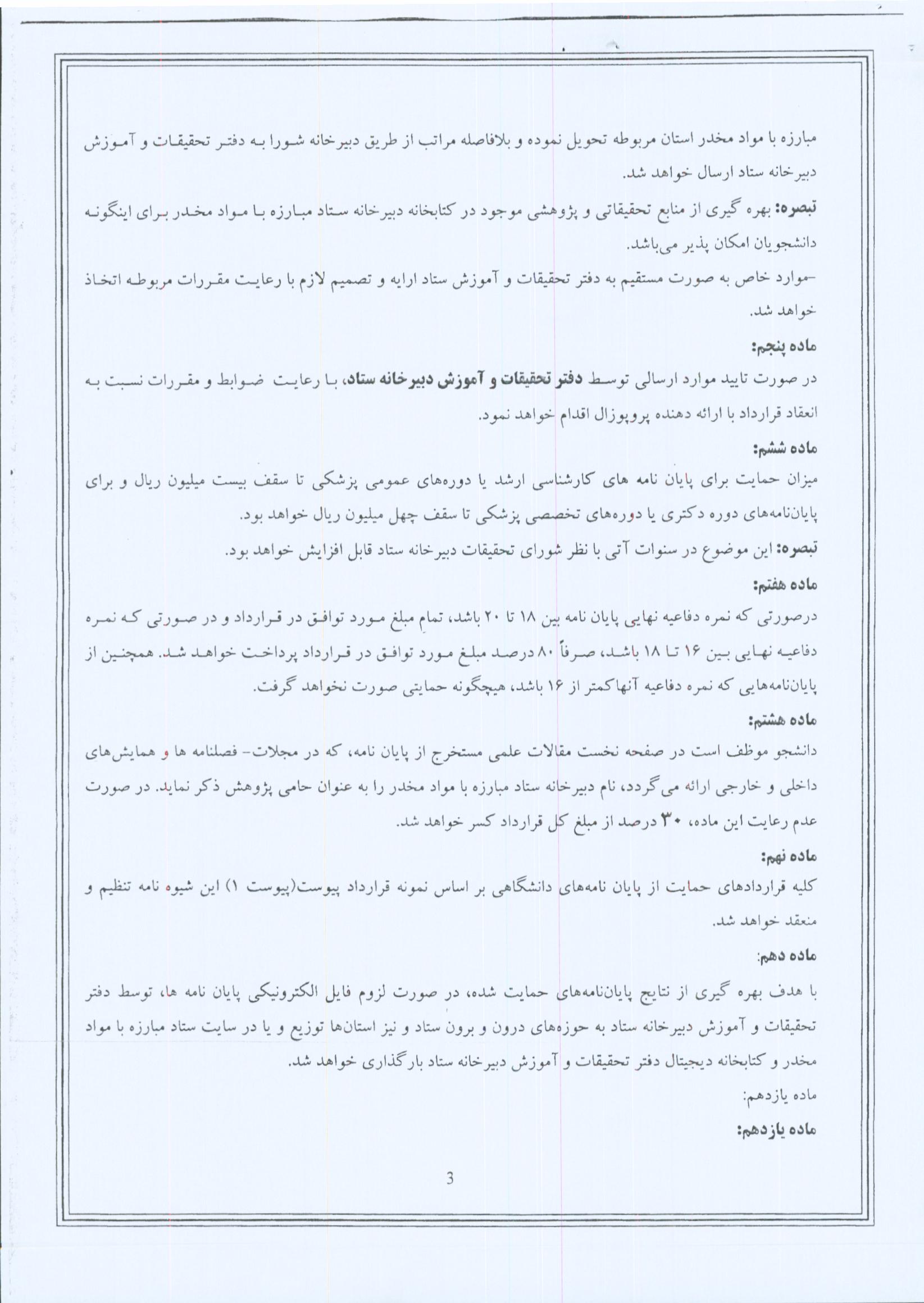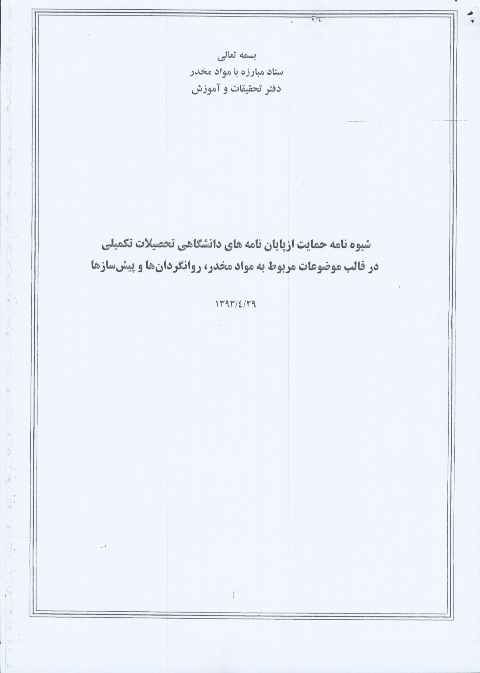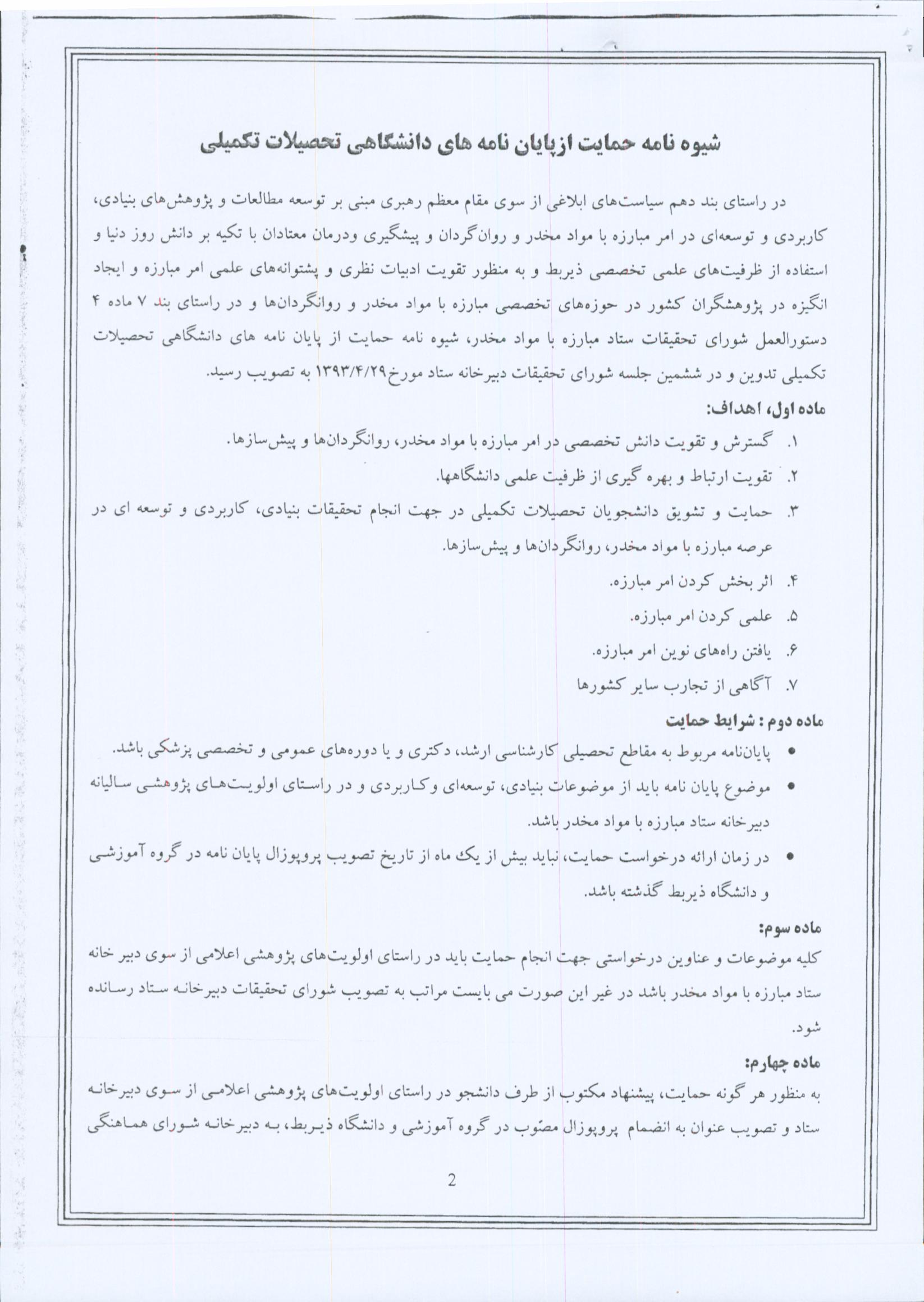 به اطلاع رزیدنتهای عزیز می رساند يك نسخه از شيوه نامه حمايت از پايان نامه هاي دانشگاهي تحصيلات تكميلي مصوب ششمین جلسه شورای تحقیقات دبیرخانه ستاد مبارزه با مواد مخدر ریاست جمهوری جهت مطالعه به پیوست آمده است