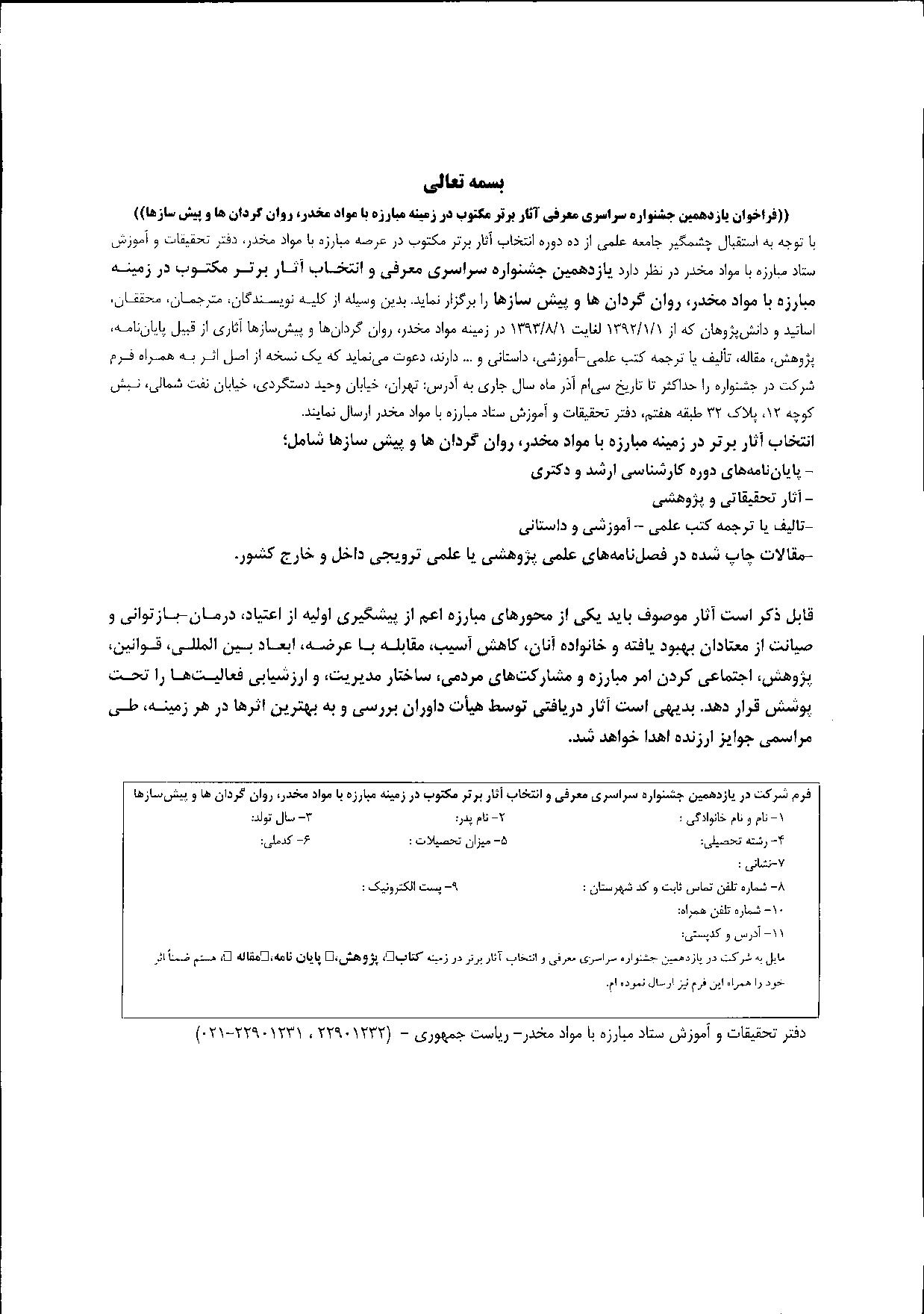 فراخوان یازدهمین جشنواره سراسری معرفی آثار برتر مکتوب در زمینه مبارزه با مواد مخدر.....