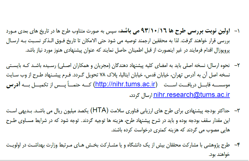 به اطلاع میرساند موسسه ملي تحقيقات سلامت جمهوري اسلامي ايران در راستای سیاست های پژوهشی و کاربردی ،آمادگی خود را مبنی بر پذیرش طرح های پیشنهادی (پیوست)حوزه های مختلف وزارت متبوع اعلام میدارد.