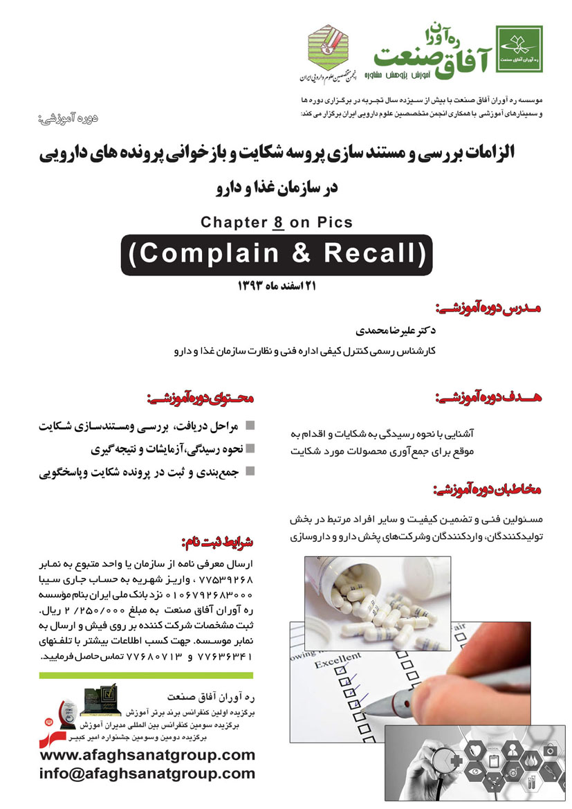 اطلاع رسانی دوره آموزشي الزامات بررسی و مستندسازی پروسه شکایت و بازخوانی پرونده های دارویی..