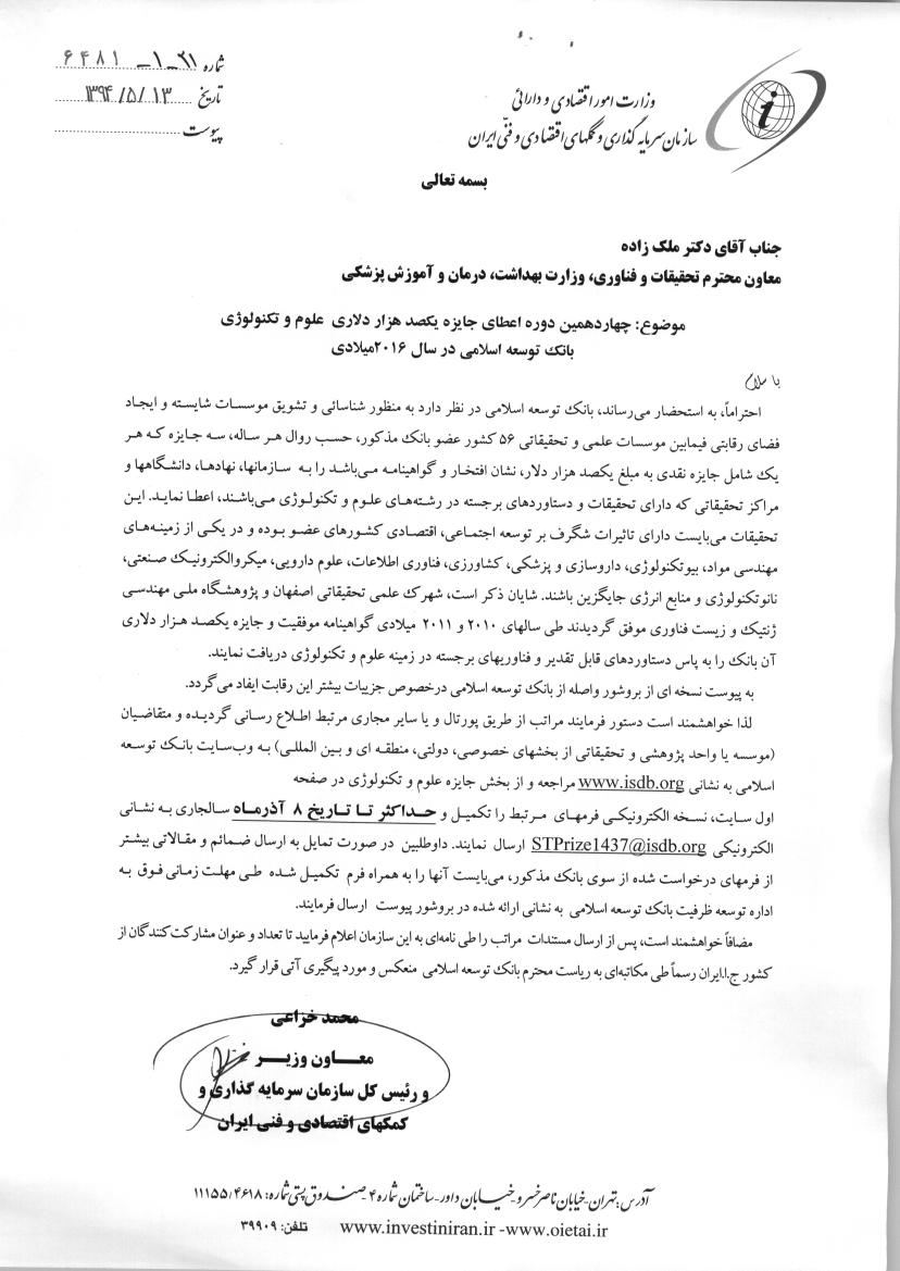 چهاردهمين دوره اعطاي جايزه يك صد هزار دلاري علوم تكنولوژي بانك توسعه اسلامي درسال 2016 ميلادي